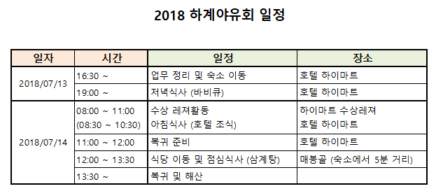 | 첨부파일 | 20180712_하계야유회_일정[1].PNG 20180712_하계야유회_방배정[1].PNG 20180712_하계야유회_참석자명단[2].pdf |